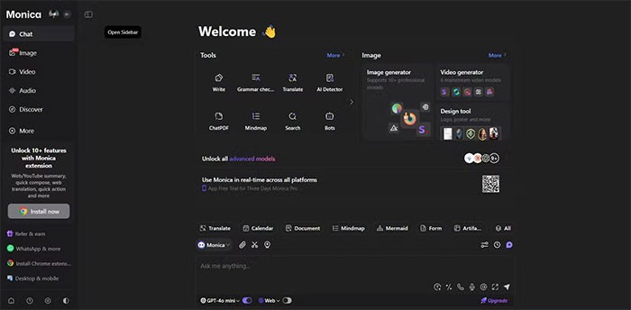 Monica là một trợ lý AI đa năng, cho phép người dùng tận dụng sức mạnh của nhiều mô hình AI mà không tốn phí. Nhờ những tính năng vượt trội, Monica đã nhanh chóng trở thành một trong những tiện ích mở rộng AI Chrome được ưa chuộng nhất. Ứng dụng này có sẵn dưới dạng tiện ích mở rộng Chrome, ứng dụng trên máy tính, điện thoại thông minh và thông qua giao diện web.