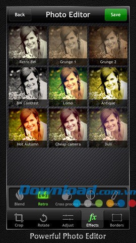 - Hiệu ứng ảnh – ứng dụng cung cấp 72 hiệu ứng ảnh độc đáo như Clarify, Fake HDR, tranh phác thảo, tự động điều chỉnh độ tương phản, Sepia, thang màu xám, cổ điển, Grunge, Lomo, Cross Process, giảm nhiễu và nhiều hiệu ứng khác.
