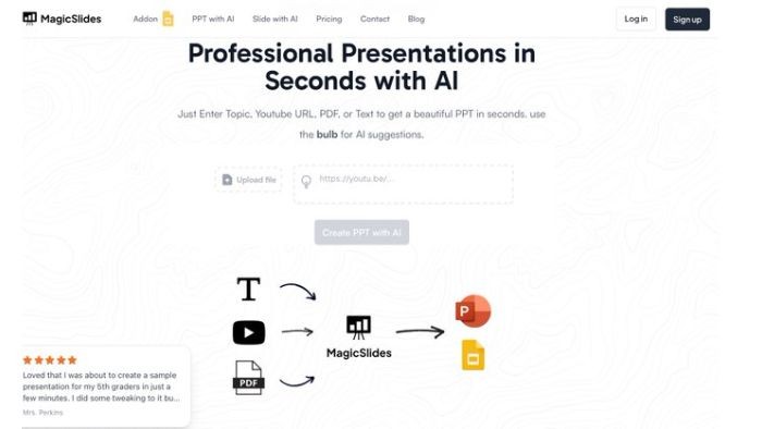 MagicSlides là một công cụ AI mạnh mẽ, phù hợp cho cả doanh nghiệp và cá nhân, cho phép tạo bài thuyết trình từ nhiều nguồn khác nhau, không chỉ từ văn bản mà còn từ file PDF hoặc đường link video YouTube.