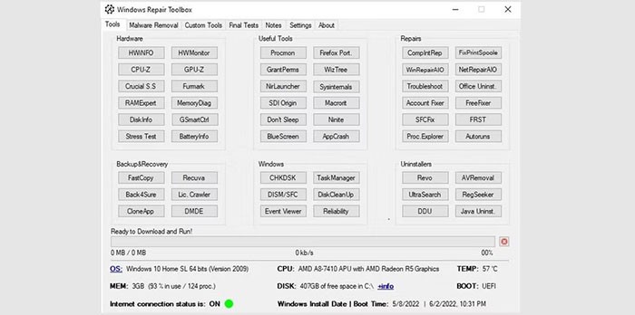 Trong trường hợp máy tính gặp phải nhiều vấn đề phổ biến của Windows 10, người dùng có thể tìm thấy một loạt các ứng dụng hỗ trợ trong mục Repairs. Việc sử dụng bất kỳ công cụ nào trong Windows Repair Toolbox rất đơn giản, chỉ cần chọn công cụ mong muốn, đợi quá trình tải xuống hoàn tất và bắt đầu sử dụng.