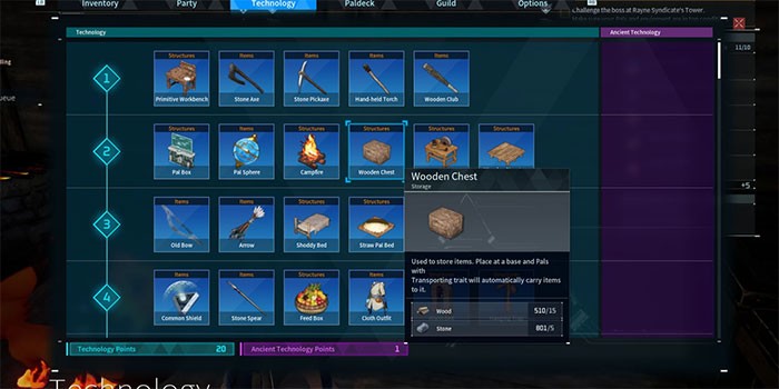 Palworld là một trò chơi sinh tồn, do đó, người chơi sẽ cần thu thập một lượng lớn tài nguyên, từ gỗ đến các loại thịt khác nhau. Dung lượng hành lý của người chơi cũng có giới hạn, mặc dù giới hạn trọng lượng có thể được nâng cao. Để tối ưu hóa việc lưu trữ, việc xây dựng các thùng chứa là giải pháp hiệu quả nhất.