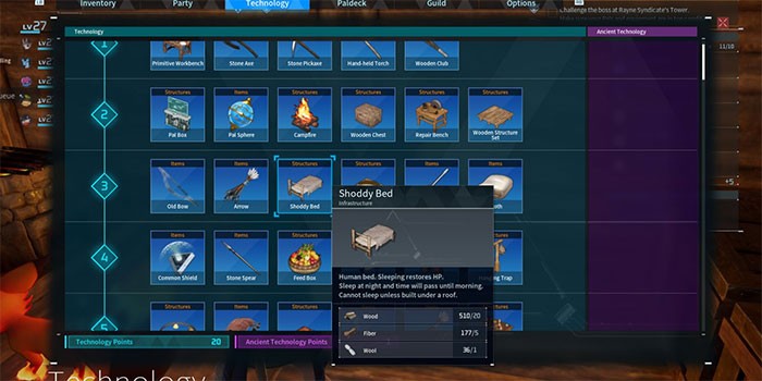 Palworld có hệ thống ngày và đêm, vì vậy người chơi cần ngủ trên giường để vượt qua thời gian. Shoddy Bed là chiếc giường đầu tiên mà người chơi có thể tự chế tạo, và nó yêu cầu một cấu trúc có mái che, chẳng hạn như một ngôi nhà. Điều này đồng nghĩa với việc người chơi cần mở khóa Wooden Structure Set trong cây công nghệ cùng với Shoddy Bed.
