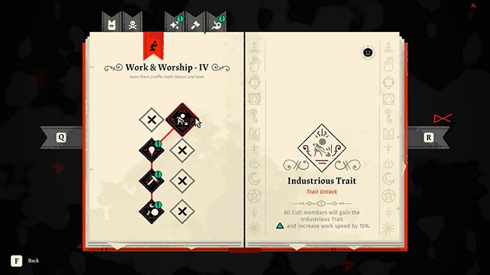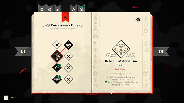 Khi tất cả các Follower đều tin vào Materialism Trait, việc xây dựng những khu vực nghỉ ngơi đơn giản, giá rẻ sẽ thúc đẩy đức tin của họ một cách đáng kể. Quá trình này tạo ra một vòng lặp liên tục để thu thập Faith. Chỉ cần nâng cấp khu Sleep Quarter và để những tín đồ trung thành thu thập tài nguyên, việc nâng cấp sẽ trở nên dễ dàng hơn.