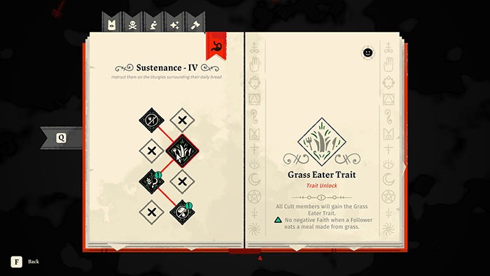 Sau khi mở khóa Doctrine này, tín đồ sẽ hài lòng với những bữa ăn đơn giản được làm từ cỏ, và vẫn sẵn sàng phục vụ tận tâm. Điều này giúp người chơi giảm bớt gánh nặng thu thập hạt giống và đa dạng hóa các loại cây trồng.