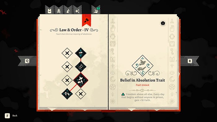 Giáo lý này mang tính tích cực bởi vì chủ giáo phái có thể xử lý một số Follower bằng cách loại bỏ họ thay vì giam giữ. Việc này giúp dễ dàng tránh việc bỏ tù bất kỳ tín đồ nào có quan điểm khác biệt. Kết quả là, người chơi sẽ nhận được một lượng lớn Faith mỗi ngày, bên cạnh những lợi ích từ mỗi tòa nhà mới được xây dựng. Với sự gia tăng đáng kể về Faith, khả năng xuất hiện các tín đồ bất đồng quan điểm sẽ giảm thiểu.