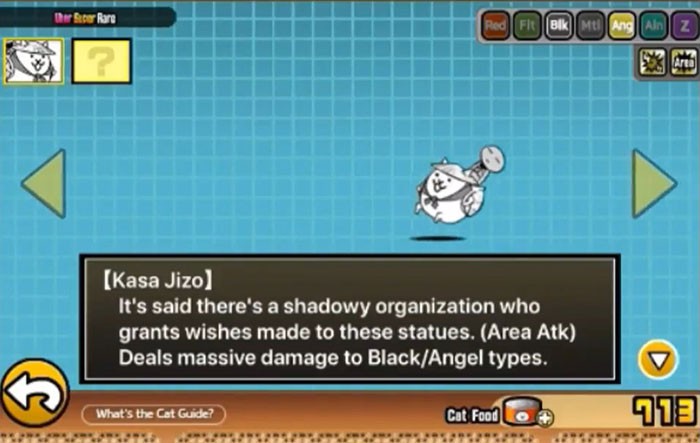Kasa Jizo là một chú mèo Uber đặc biệt hiếm, có thể nhận được thông qua Rare Cat Capsule trong sự kiện gacha Ancient Heroes Ultra Souls. Tương tự như các con mèo Ultra Souls khác, Kasa Jizo có các chỉ số riêng biệt ở dạng bình thường (có thể spam) và dạng tiến hóa (hiệu suất cao). Những hình thức độc đáo này mang lại những điểm mạnh khác nhau, khiến chúng có giá trị trong nhiều tình huống khác nhau tùy thuộc vào nhu cầu của người chơi.
