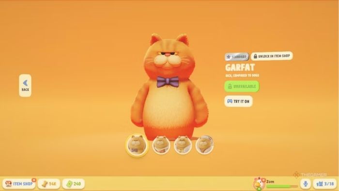 Có thể dễ dàng nhận thấy Garfat được thiết kế dựa trên hình mẫu chú mèo Garfield quen thuộc. Trong thế giới của Party Animals, nhân vật này được tái hiện với kích thước lớn hơn, làm nổi bật tính cách lười nhác và niềm đam mê ẩm thực đặc trưng. So với những loài vật khác, Garfat là một lựa chọn vừa đáng yêu vừa mang tính giải trí cao, đặc biệt khi người chơi sử dụng cậu ta để chiến đấu với đối thủ trong hành trình tìm kiếm món lasagna trứ danh.