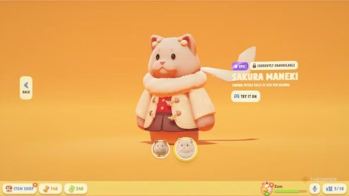 Trong Party Animals, dù có nhiều nhân vật mèo khác nhau, Maneki vẫn nổi bật với vẻ ngoài sang trọng và quý phái. Chú mèo thần tài này sở hữu bộ lông tam thể đặc trưng, kết hợp cùng vòng cổ đỏ sọc vàng và chiếc chuông nhỏ đáng yêu.