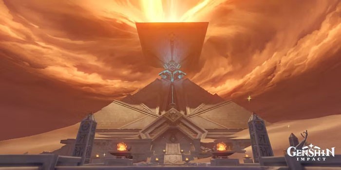 Kiến trúc của công trình này mang một nét độc đáo, khác biệt so với những gì đã được chứng kiến tại Teyvat, thể hiện rõ ràng ảnh hưởng từ những kim tự tháp cổ đại của Ai Cập.