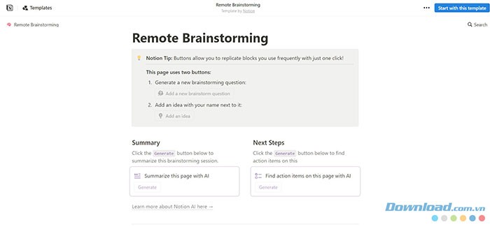 Remote Brainstorming Template của Notion là một công cụ hữu ích cho các nhóm cộng tác. Nó cung cấp một không gian để tạo ra các ý tưởng mới, phác thảo chiến lược và trực quan hóa các khái niệm, giúp cho các buổi brainstorm trên Notion trở nên dễ dàng và hiệu quả hơn.