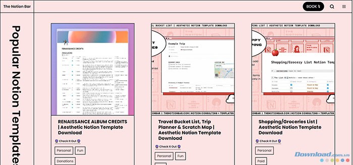 Các template Aesthetic của The Notion Bar được phân loại đa dạng, bao gồm các lựa chọn dành cho sinh viên, cá nhân, môi trường làm việc chuyên nghiệp, các hoạt động giải trí, và các dự án hợp tác. Người dùng có thể khám phá một bộ sưu tập phong phú các thiết kế độc đáo, giúp cải thiện đáng kể trải nghiệm sử dụng và tối ưu hóa không gian làm việc trên Notion.