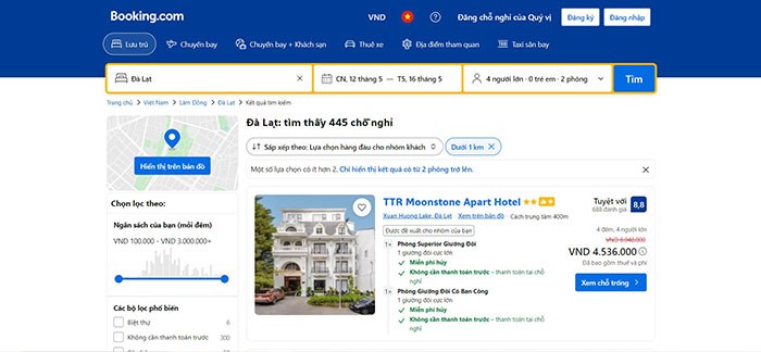 Đặt phòng khách sạn, biệt thự,... với hơn 4.000.000 lựa chọn chỗ ở bằng ngôn ngữ và đơn vị tiền tệ bạn mong muốn. Dễ dàng tìm kiếm chỗ ở phù hợp với sở thích của bạn bằng cách sử dụng các bộ lọc, xem ảnh độ phân giải cao, bản đồ, thông tin địa phương và hơn 35 triệu đánh giá đã được xác minh từ những du khách khác.