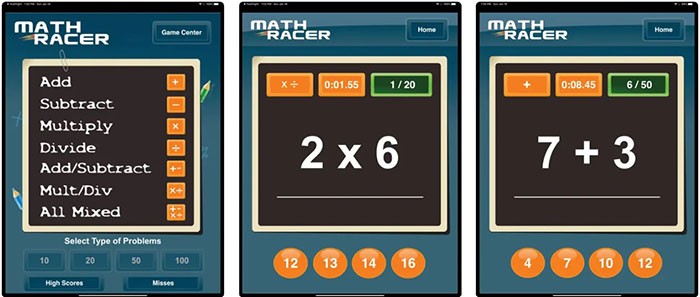 Trong Math Racer, người dùng có thể lựa chọn một trong bảy chế độ luyện tập khác nhau. Bốn chế độ đầu tiên tập trung vào các phép toán cơ bản: cộng, trừ, nhân và chia.