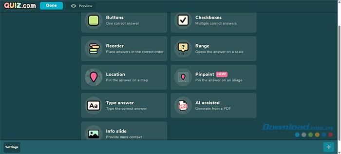 Người dùng có thể xây dựng các câu hỏi trắc nghiệm với nhiều hình thức khác nhau, như lựa chọn đa đáp án, xác định đúng/sai, hoặc các câu hỏi tự luận. Quiz.com cũng cung cấp khả năng tích hợp hình ảnh, video và giới hạn thời gian cho mỗi câu hỏi, nhằm tăng tính tương tác và hấp dẫn cho bài kiểm tra.