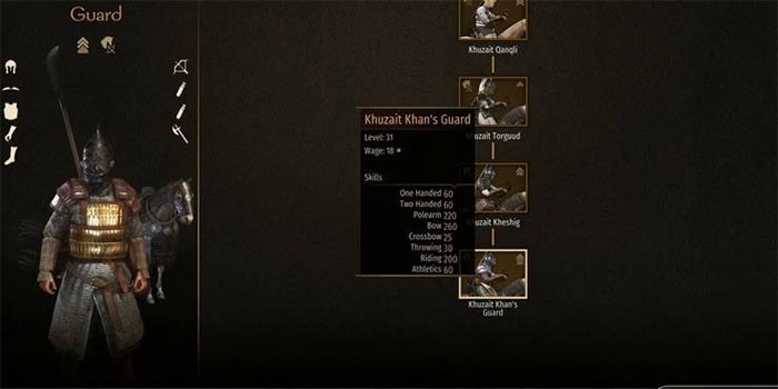 Tiếp tục đề cập đến các đơn vị kỵ binh mạnh mẽ, không thể bỏ qua Khuzait Khan's Guard. Đơn vị này dẫn đầu trong phân khúc của mình nhờ khả năng bắn cung vượt trội. Với kỹ năng bắn cung ấn tượng 260 và vũ khí Steppe Recurve Bow mạnh mẽ, họ thực chất là những nhà vô địch Fian nhưng có khả năng cưỡi ngựa.