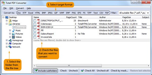Total PDF Converter hỗ trợ danh sách các loại file output phong phú, bao gồm: DOC, RTF, XLS, HTML, BMP, JPEG, GIF, WMF, EMF, PNG, EPS, PS, TIFF, TXT, CSV và PDF.