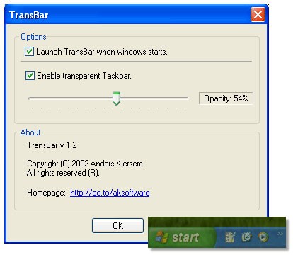 TransBar là một ứng dụng nhỏ gọn, hỗ trợ thay đổi độ trong suốt của thanh Taskbar trên hệ điều hành Windows. Nó cho phép bạn làm cho thanh Taskbar trở nên trong suốt hoặc tùy chỉnh chức năng Auto Hide.
