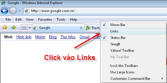 Nếu chưa hiển thị, bạn hãy nhấp chuột phải vào một khoảng trống trên thanh Menu và chọn Links để kích hoạt nó.