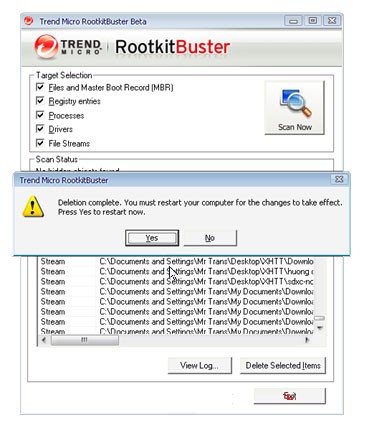 Cuối cùng, chọn Delete Selected Items để xóa bỏ các tập tin bị nhiễm. Chương trình sẽ yêu cầu khởi động lại máy tính. Hãy nhấn Yes để hoàn tất quá trình.