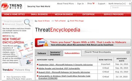 Trend Micro phân loại các đối tượng độc hại thành các nhóm chính: Trojan (một dạng phần mềm hệ thống gây hại cho máy tính), Spyware (phần mềm gián điệp), và Vulnerabilities (các điểm yếu dễ bị khai thác bởi virus cùng với các bản vá lỗi cần thiết để khắc phục).