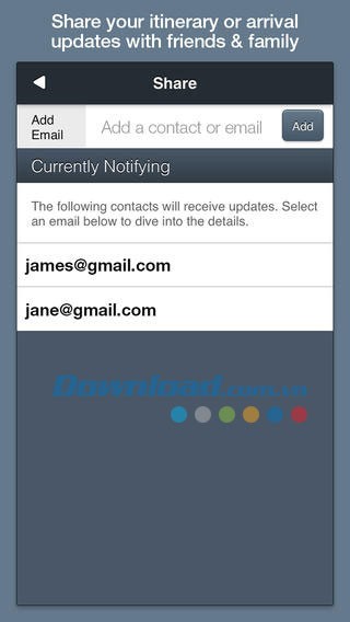 Bạn bè, gia đình hoặc đồng nghiệp có thể cần một phần hoặc toàn bộ kế hoạch du lịch của bạn. Cập nhật giờ khởi hành chuyến bay, sân bay, cửa ra tàu và các thay đổi khác, tất cả đều được chia sẻ dễ dàng qua TripCase. Bạn chỉ cần thêm địa chỉ email của người nhận vào chuyến đi của mình.
