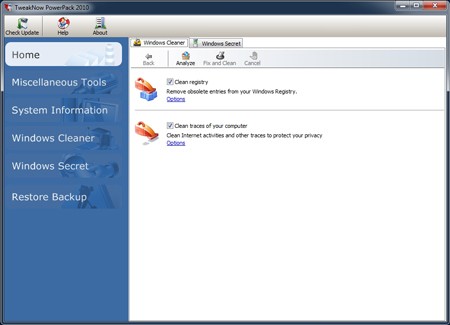 Ngay sau khi cài đặt, giao diện khởi động đầu tiên của TweakNow PowerPack sẽ đưa bạn đến khu vực làm việc chính, với công cụ dọn dẹp rác thải hệ thống được đặt trong thẻ Home. Cùng với thẻ Home ở cửa sổ bên trái, bạn sẽ tiếp cận được nhiều tùy chọn tinh chỉnh hệ thống khác.