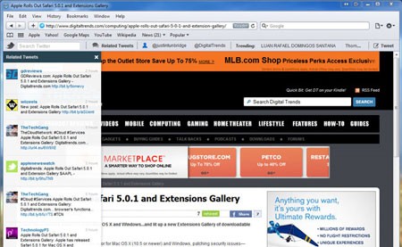 Tương tự, khi chọn "Related Tweets", một thanh bên sẽ xuất hiện, hiển thị 15 tweet chứa liên kết đến trang web đang được xem. Nhờ đó, người dùng có thể dễ dàng nắm bắt những gì cộng đồng mạng đang chia sẻ về trang đó.