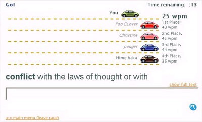 Sau khi bạn chọn Race against others, bạn sẽ cần chờ ít nhất một người chơi khác tham gia. Thời gian của cuộc đua có giới hạn, không kéo dài đến khi tất cả người chơi hoàn thành. Khi về đích, bạn sẽ thấy bảng xếp hạng thành tích và tốc độ gõ phím của mình (tính bằng số từ gõ được trong một phút – wpm).