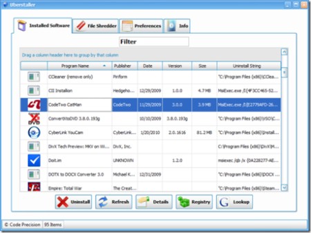 Uberstaller sở hữu khả năng nhận diện và liệt kê đầy đủ các chương trình đã được cài đặt trên hệ thống, hiển thị trong một giao diện trực quan, dễ sử dụng. Nhờ đó, người dùng có thể dễ dàng nắm bắt thông tin chi tiết về từng ứng dụng, bao gồm: tên chương trình, nhà phát triển, ngày cài đặt, phiên bản, dung lượng sử dụng và chuỗi uninstall.