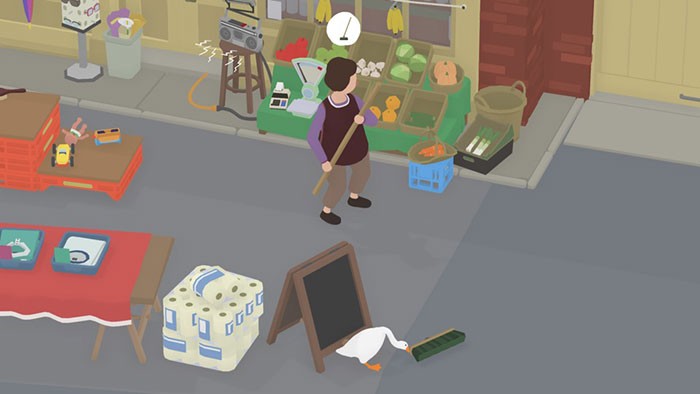 Trong quá trình hóa thân thành chú ngỗng, nếu bạn bị Người bán hàng phát hiện ở gần cửa hàng, cô ấy sẽ sử dụng cây chổi để xua đuổi bạn.