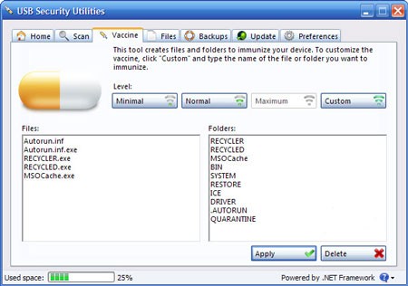 3. Chức năng Vaccine cho phép bạn tạo ra các file và thư mục giả như Autorun.inf, Recycler.exe, MSOCache.exe, thư mục BIN, SYSTEM, QUARANTINE, nhằm ngăn chặn virus lợi dụng để xâm nhập vào hệ thống. Bạn có thể chọn một trong ba mức độ bảo vệ: Minimal, Normal, Maximum. Mức độ bảo vệ càng cao, số lượng file và thư mục giả được tạo ra càng nhiều. Bạn có thể xem danh sách các file và thư mục giả được tạo ra trong khung Files và Folders, sau đó chọn mức độ phù hợp. Ngoài ra, mục Custom cho phép bạn tự tạo file và thư mục giả với tên tùy ý. Sau khi hoàn tất, nhấn Apply để kích hoạt tính năng bảo vệ autorun. Thông báo Your device have been immunized successfully sẽ xuất hiện khi quá trình hoàn tất. Để tắt tính năng này, nhấn nút Delete để xóa các file và thư mục giả.