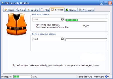 5. Thẻ Backups hỗ trợ sao lưu dữ liệu từ USB để khôi phục khi cần thiết. Trước khi sao lưu, bạn cần tắt tính năng Vaccine bằng cách nhấn nút Delete trong thẻ Vaccine. Sau đó, nhấn nút Start tại trường Perform a backup và chọn thư mục lưu trữ bản sao lưu. Khi quá trình sao lưu hoàn tất, thông báo Backup succeeded sẽ xuất hiện. Để khôi phục dữ liệu, nhấn nút Start tại trường Restore previous backup và chọn thư mục chứa bản sao lưu.