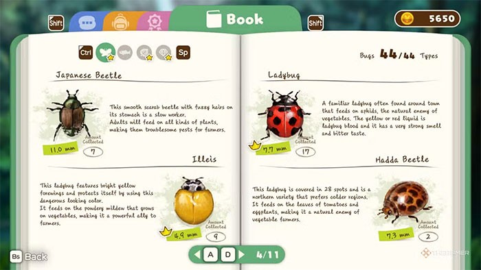 Mỗi khi yêu cầu Kazuko cập nhật thêm thông tin mới, người chơi sẽ nhận được một khoản tiền thưởng là Yên từ cô ấy. Khoản thưởng này sẽ tiếp tục được trao cho đến khi danh mục côn trùng trong sổ tay được hoàn thiện với đầy đủ 44 loài.
