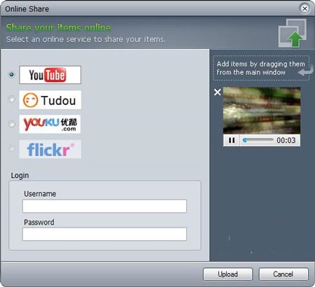 VideoFlick cung cấp khả năng tải ảnh, video lên bốn dịch vụ chia sẻ phổ biến: Youtube, Tudou, Youku và Flickr.