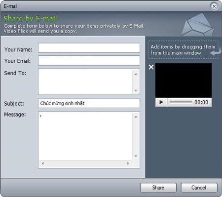 - VideoFlick giúp bạn dễ dàng chia sẻ video với bạn bè và gia đình thông qua email, với tùy chọn đính kèm miễn phí.