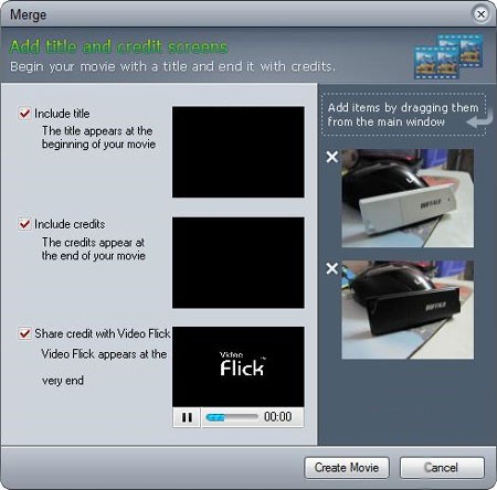 Khi hộp thoại Merge hiện ra, hãy đánh dấu chọn mục Include title nếu bạn muốn thêm một đoạn giới thiệu cho slideshow. Nội dung giới thiệu sẽ được nhập vào ô văn bản kế bên. Tương tự, tích vào ô Include credits để tạo đoạn kết thúc slideshow. Nếu muốn chèn logo của VideoFlick vào cuối slideshow, hãy chọn Share credit with VideoFlick.