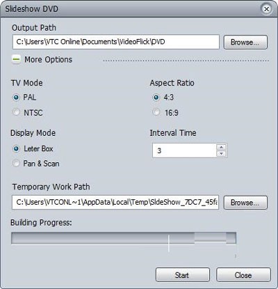 Trong hộp thoại Slideshow DVD, bạn cần chỉ định thư mục lưu trữ nội dung DVD bằng cách sử dụng mục Output Patch. Tiếp theo, nhấn nút More Options để tùy chỉnh các thiết lập nâng cao, bao gồm: (chuẩn phát hình), (tỷ lệ khung hình), (kiểu hiển thị), (thời gian hiển thị mỗi ảnh), và (thư mục tạm thời để lưu trữ dữ liệu trong quá trình xử lý).