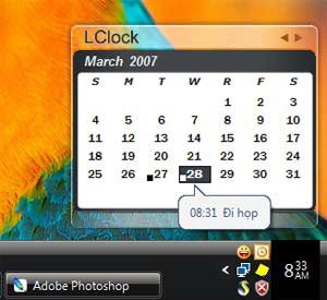 Một điểm đặc biệt của chương trình là tính năng đồng hồ và lịch. Khi bạn nhấp chuột trái vào mục thông báo giờ trên khay hệ thống, lịch tháng LClock trong suốt sẽ hiện ra. Nhấp đúp chuột vào bất kỳ ngày nào, bạn có thể ghi chú công việc cần thực hiện cho ngày đó vào một giờ cụ thể.