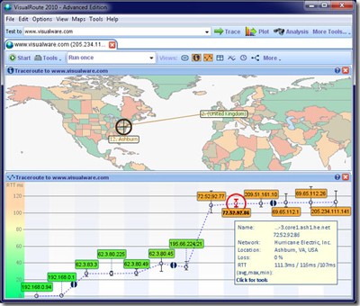 Cụ thể, VisualRoute 2010 14.0j sẽ trình bày chi tiết từng bước truyền dữ liệu qua các máy chủ và bộ định tuyến, đồng thời cung cấp thông tin về địa chỉ IP của từng thiết bị và thời gian cần thiết để hoàn thành mỗi bước.