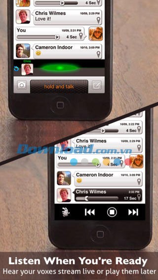Truy cập danh sách trò chuyện, chọn Chat, nhấn và giữ nút "Hold and Talk" để bắt đầu nói. Thả ngón tay ra khi tin nhắn audio hoàn tất. Tin nhắn sẽ được gửi ngay lập tức đến người nhận trong khi bạn đang nói.