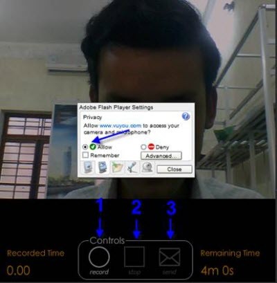 Khi hệ thống hiển thị thông báo từ Adobe Flash Player, hãy chọn Allow > Close, rồi nhấn Record để bắt đầu thu âm. Sau khi hoàn tất, bạn nhấn Stop > Send để gửi lời chúc đến người nhận.
