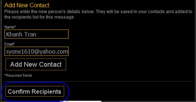 Tiếp theo, bạn nhấn Add Recippients, sau đó nhập tên và địa chỉ email của người nhận vào các trường tương ứng (Name, Email). Nhấn Add New Contact để thêm người nhận. Nếu bạn muốn gửi cho nhiều người cùng lúc, hãy lặp lại quá trình này và chọn Confirm Recipients để xác nhận.