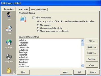 Watchdog còn cho phép hạn chế các chương trình được phép chạy trên từng tài khoản. Nhấp đúp vào tài khoản muốn hạn chế, cửa sổ Edit user information sẽ xuất hiện. Nhấp vào nút Restrict và chuyển sang thẻ Program Restrictions.