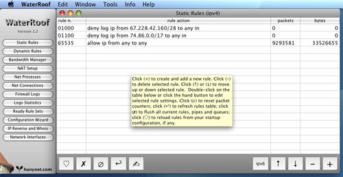 Việc triển khai tường lửa IPFW trở nên nhanh chóng và đơn giản hơn bao giờ hết với WaterRoof. Khả năng cài đặt NAT cho phép người dùng tùy chỉnh việc chia sẻ kết nối mạng trong môi trường LAN. Đồng thời, WaterRoof cũng hỗ trợ xây dựng một hệ thống tường lửa hoàn chỉnh với đầy đủ các chức năng bảo mật cho mạng của bạn.