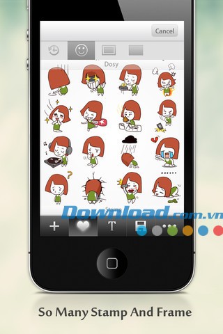 Ứng dụng sở hữu một kho hình dán đa dạng với hơn 5 nhóm chủ đề và 50 hình dán phong phú, được thiết kế rực rỡ và sống động, giúp người dùng cá nhân hóa những bức ảnh của mình.