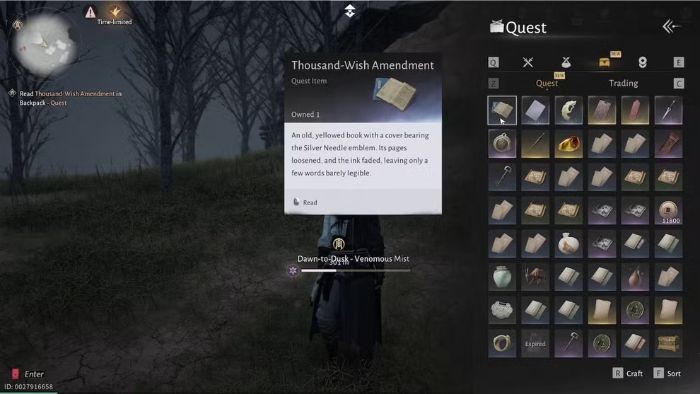 - Mở túi đồ (phím B) → chọn mục Quest Items → đọc cuốn Thousand-Wish Amendment.