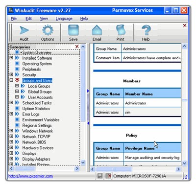 Khởi động chương trình, sau đó nhấn vào nút Options. Một cửa sổ có tên Select Categories for Auditing sẽ hiện ra. Chọn tất cả các đề mục bằng cách nhấn nút All, rồi xác nhận bằng nút Apply. Quay trở lại giao diện chính và bấm nút Audit.