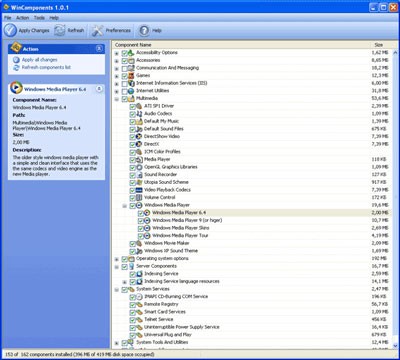 - Công cụ này cho phép loại bỏ tới 162 thành phần không cần thiết của hệ điều hành Windows, được phân loại vào 12 nhóm chính. Các nhóm bao gồm: Multimedia, Internet Utilities, Internet Information Services, System Services, Server Components, System Tools and Utilities, Operating System Options, Communication And Messaging, Accessories, Accessibility Options, Advanced Components, và Games. Việc loại bỏ những thành phần này có thể giải phóng khoảng 0,5 GB dung lượng ổ đĩa.