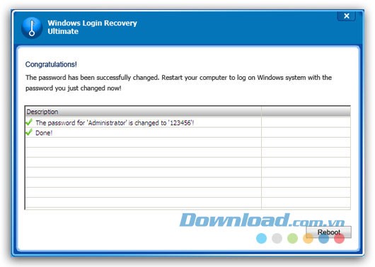 Sau khi mật khẩu Windows được thay đổi thành công, hãy tháo CD/DVD hoặc USB ra khỏi máy tính và nhấn nút Reboot. Chọn Yes để xác nhận và khởi động lại máy tính, sau đó đăng nhập bằng mật khẩu mới.