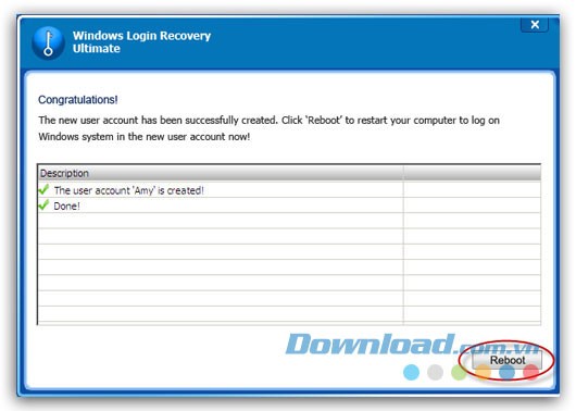 Sau khi tài khoản người dùng mới được tạo thành công, tiếp tục nhấn Reboot và Yes để hủy bỏ và khởi động lại máy tính. Sau đó, đăng nhập vào Windows bằng tài khoản vừa được tạo.